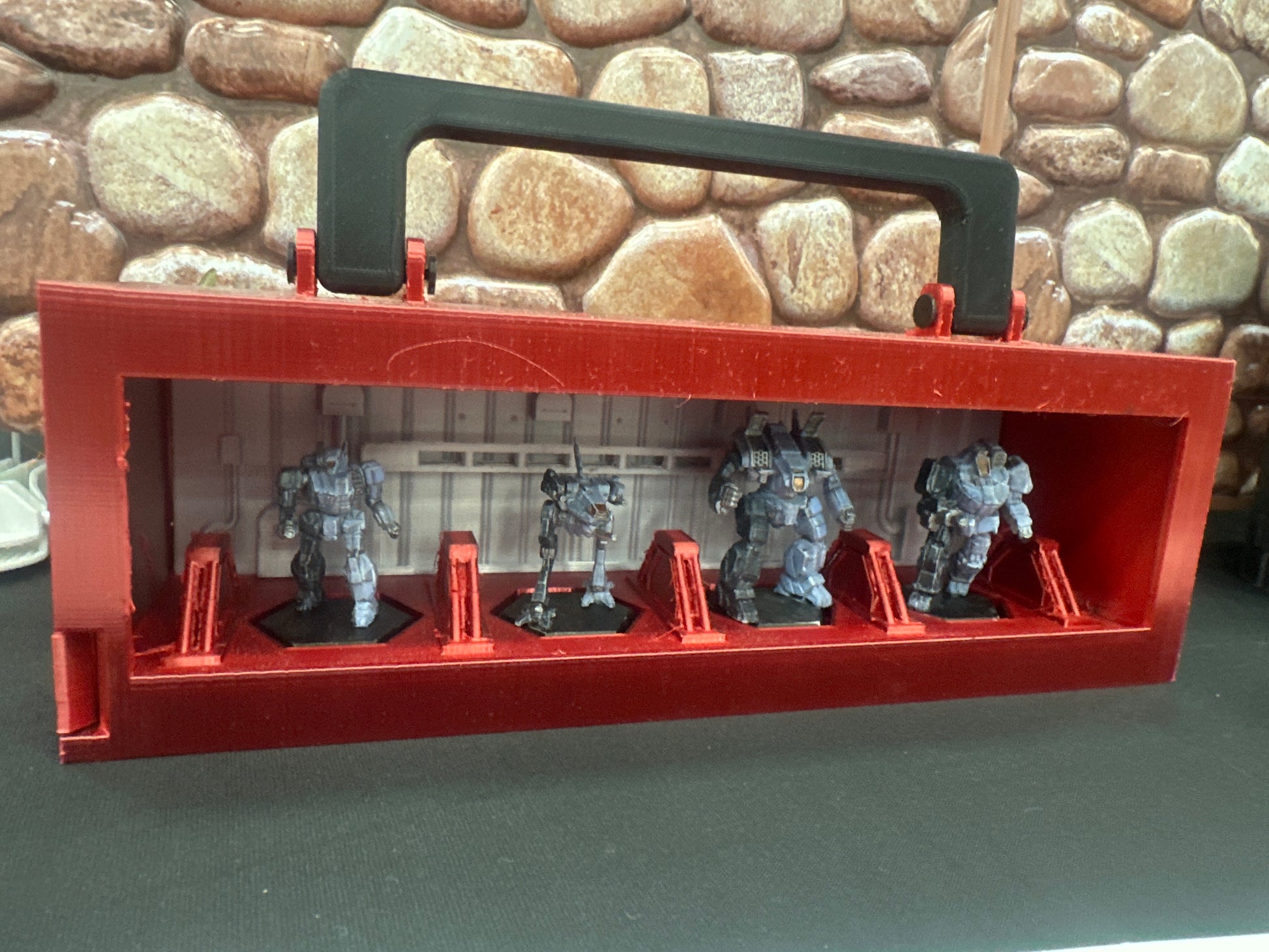 Drop onto the map in style with our Lance Carry Case and Diorama! Featuring a hangar scene this case is magnetic and securely holds your mechs in place for travel. Each kit comes with a handle, case, and door in a color of your choosing and 4 UNPAINTED diorama scene pieces (2 side walls, a background, and a base).